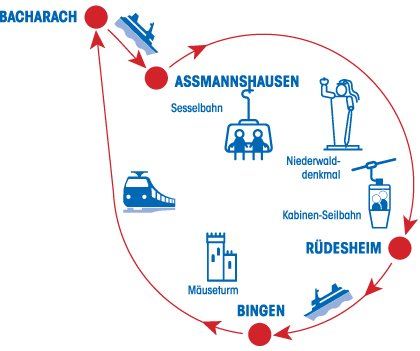 Das beliebte Ring Ticket, aber eben nicht nur von Bingen oder Rüdesheim aus, sondern ab jetzt auch von Bacharach! Starten Sie mit einer gemütlichen Schifffahrt von Bacharach nach Assmannshausen, fahren von dort aus mit der Seilbahn auf den Berg zum Niederwald und wandern eine kurze 3 km Wanderung bis zum Niederwald Denkmal. Nachdem Sie hier die wunderbare Aussicht genossen haben, fahren Sie mit der zweiten Seilbahn in die Stadt Rüdesheim. Benutzen Sie hier das Schiff oder die Fähre der Bingen-Rüdesheimer, um nach Bingen zu gelangen und fahren Sie von dort aus mit dem Zug zurück nach Bacharach.